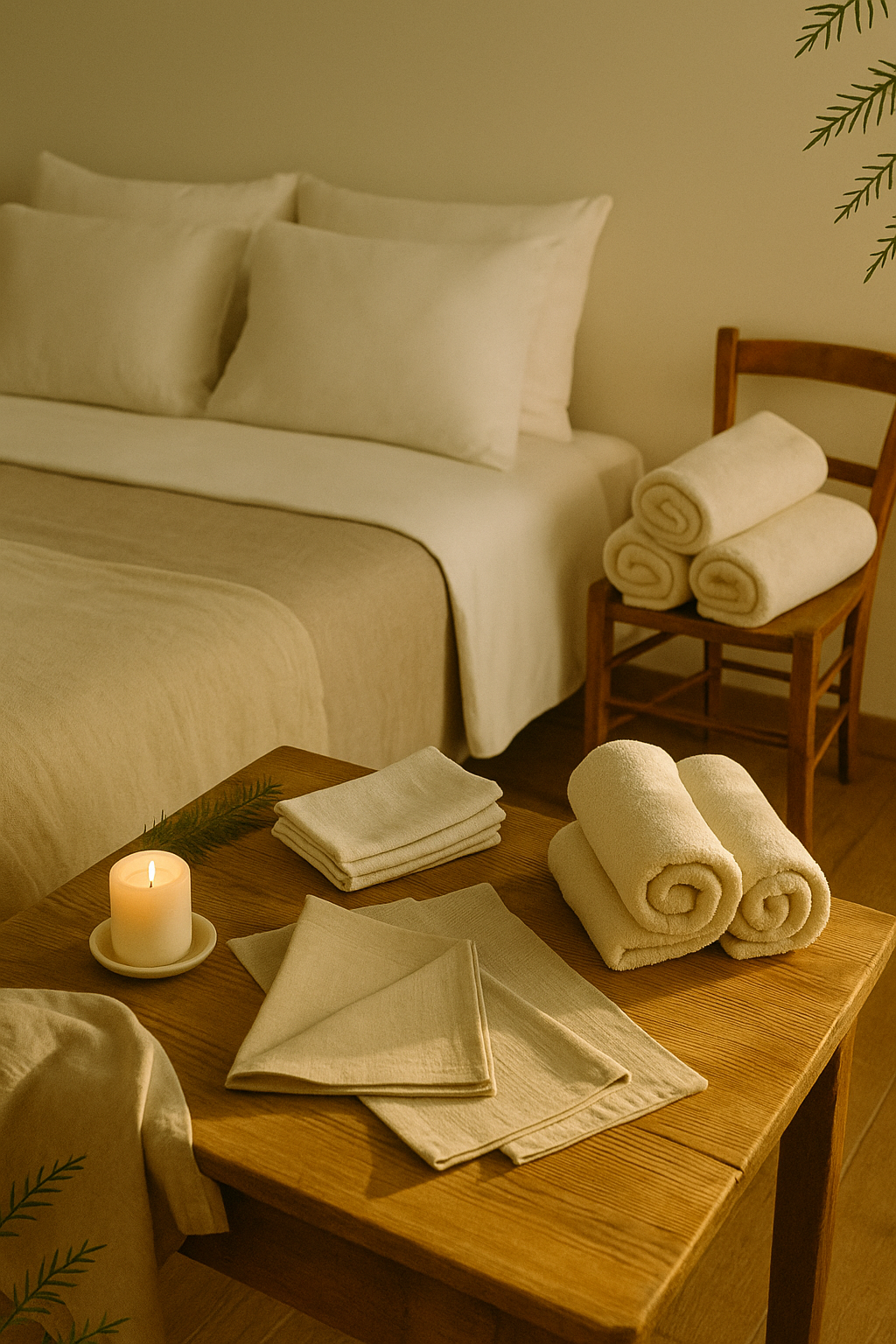 draps avec lits préparés à l’arrivée, serviettes de toilette, serviettes de table en tissu.