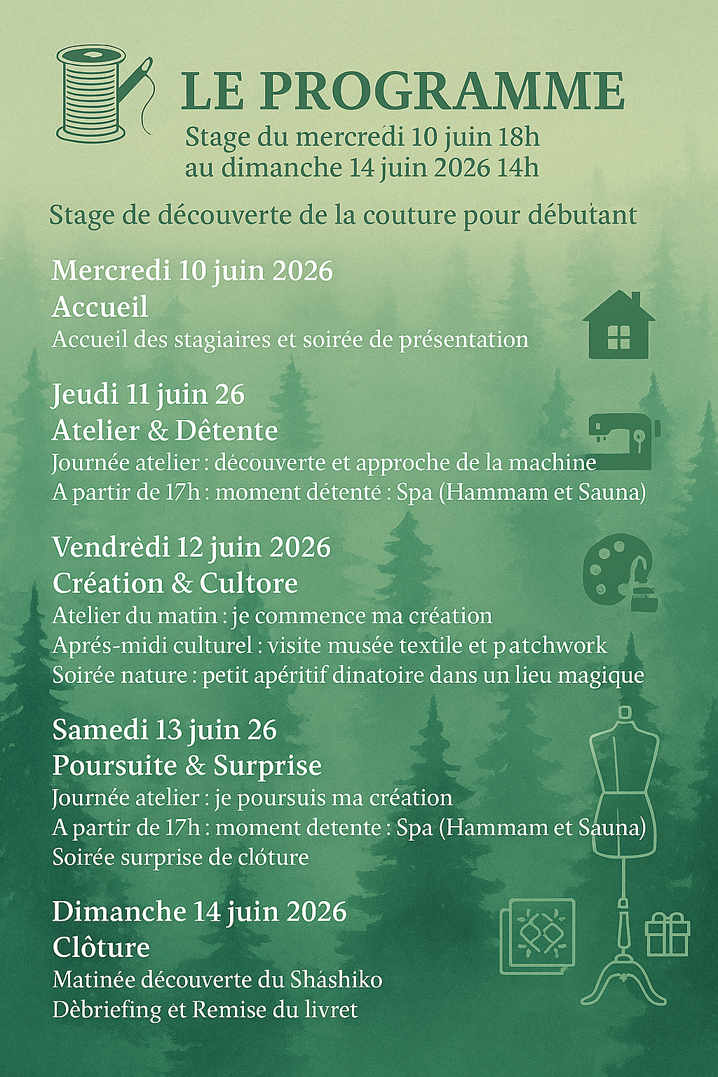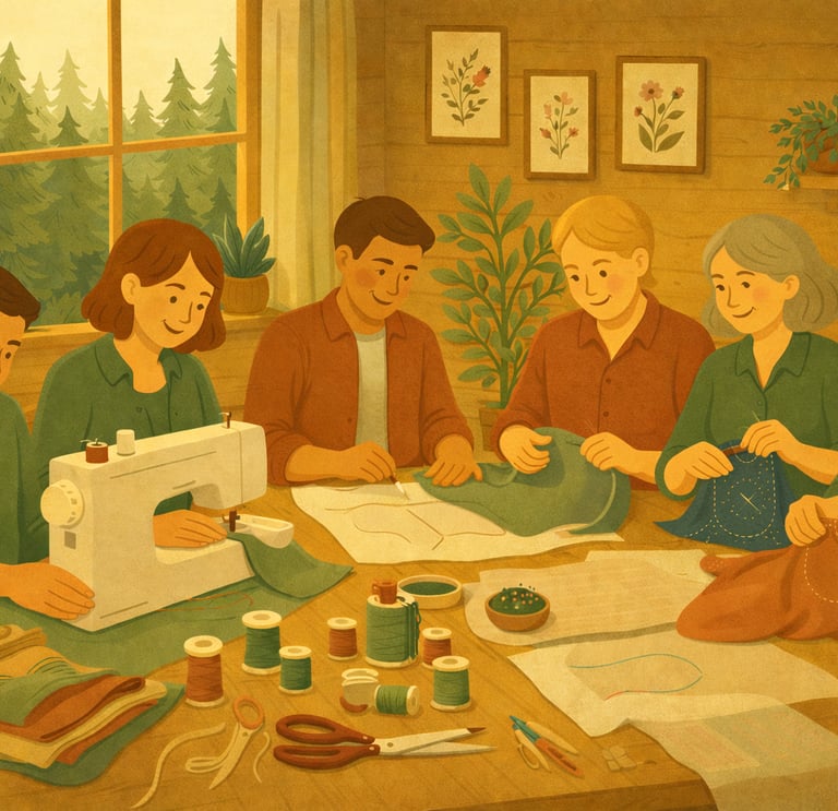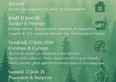 Entre le ronronnement rassurant des machines à coudre et le silence apaisant de la forêt, c'est l'occasion idéale pour apprendre, partager et libérer votre potentiel créatif dans une ambiance chaleureuse.